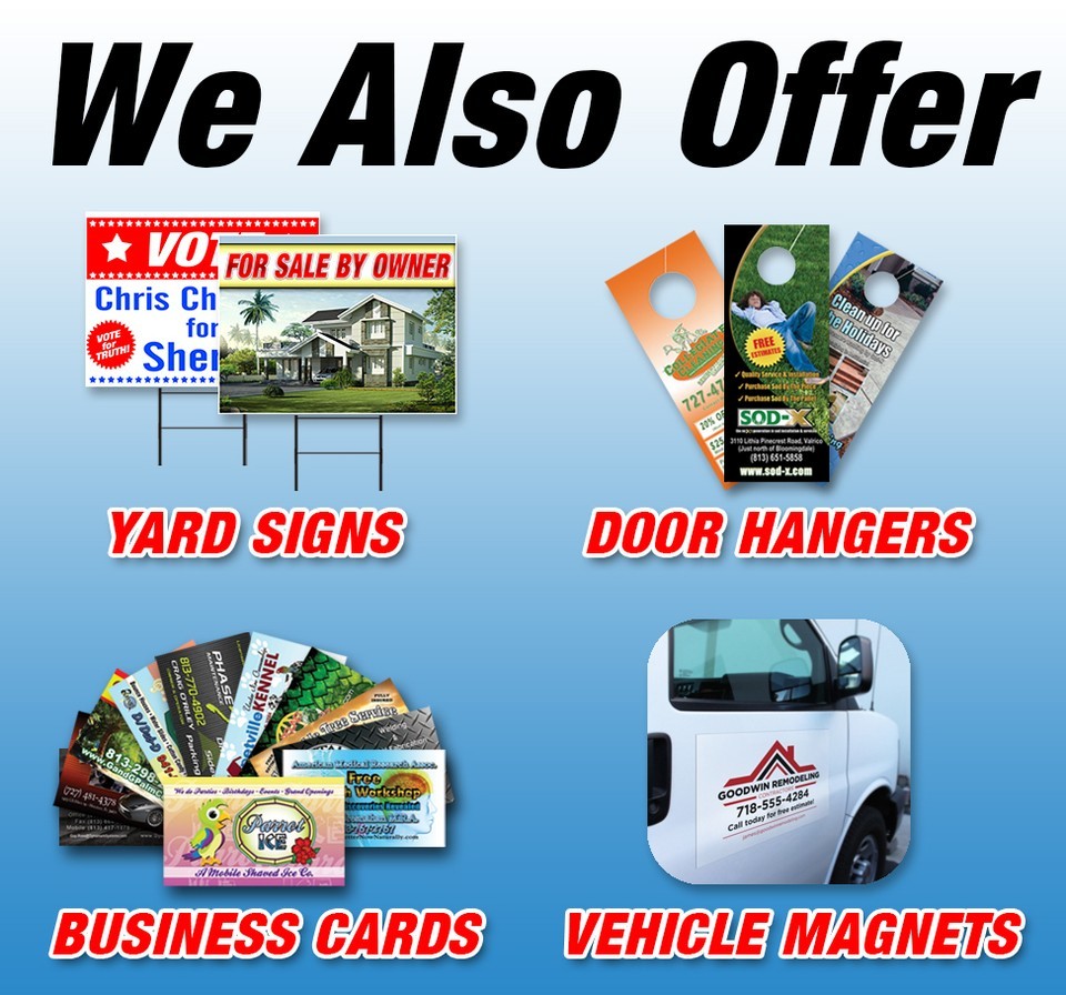 Tampa Printing uses heavy duty premium 13 oz indoor / outdoor vinyl banner material. All banners are printed using industry best latex ink technology, are UV and water resistant, and withstand hot and cold conditions. All banners include metal grommets in each corner for easy hanging. Larger banners receive additional grommets and reinforced hemming along all sides. All banner dimensions are Height (top to bottom in inches) and Width (left to right in inches).