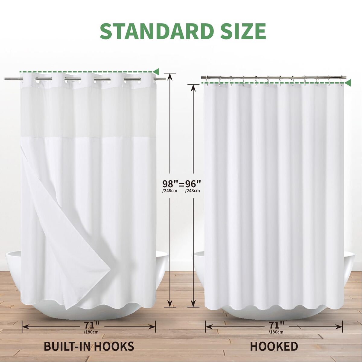 ?Fabric Shower Curtain Sets?:This white hotel shower curtain made of high quality fabric, durable, water resistant and quick-drying,features classic stylish colours add elegance and luxury to your bathroom,?Shower Curtain with Snap-On Liner?:This snap-in water resistant fabric shower curtain liner is removeable,making it convenient for cleaning or replacement.Equipped with 2 magnets at the bottom corners for added stability and to prevent splashing,?Ringless Shower Curtain?:This no hook shower curtain with liner features an innovative "built-in grommets" that allows for easy hanging and hassle-free installation,no need to remove the shower rod or buy additional hooks, saving you time and money,?Hotel Quality?:This slub textured white shower curtain and liner sets with the semi-translucent mesh at top allows natural light to enter and maintains privacy,creating a spa shower experience,?Standard Size?:71"W x 98"L(same size as 71"Wx96"L hooked shower curtain) for shower curtain and 70"W x 78"L for snap-in liner.Fits most standard-sized bathroom