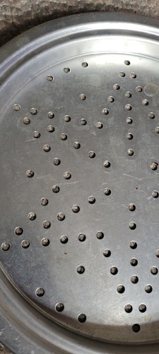 This metal pan is cute. Not sure what it's actually used for. The decoration would look cute hanging on a wall. This would make a nice addition to something.