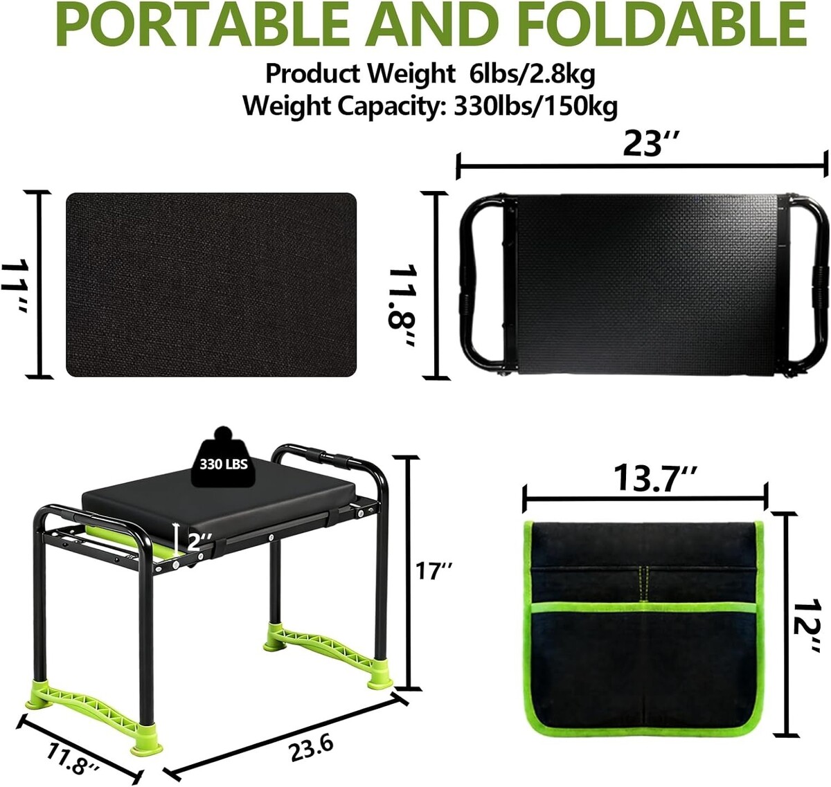 Lightweight Yet Strong: Constructed with a sturdy steel structure, this kneeler comfortably supports up to 330 lbs. Weighing just 6 lbs, it?s easy to carry by hand and can be quickly folded for compact storage in car trunks, storage sheds, or RVs.