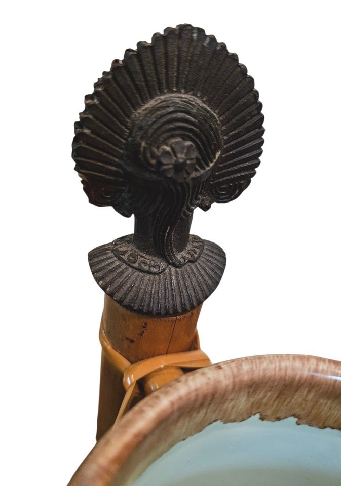 Dark brown metal head figure styled after Polynesian warrior motifs.