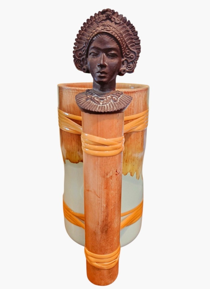 Tiki ceramic mug designed to look like a bamboo tube, featuring a decorative warrior figure attached as the handle.