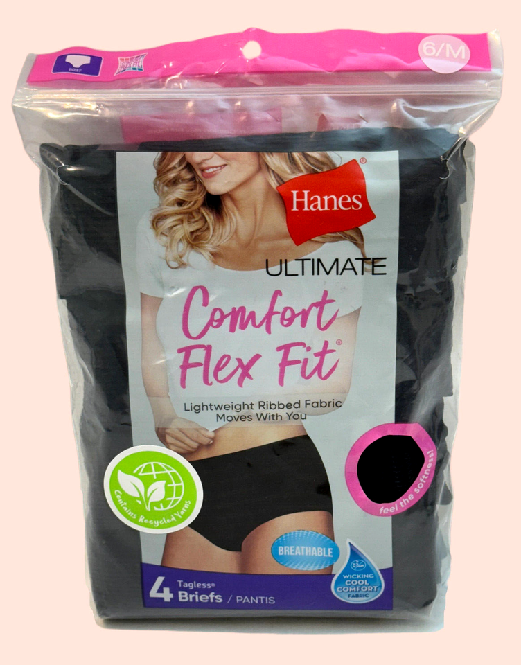 Hanes Ultimate Comfort Flex Panties Women 6 Medium Black Ribbed 4 Pair Pack
