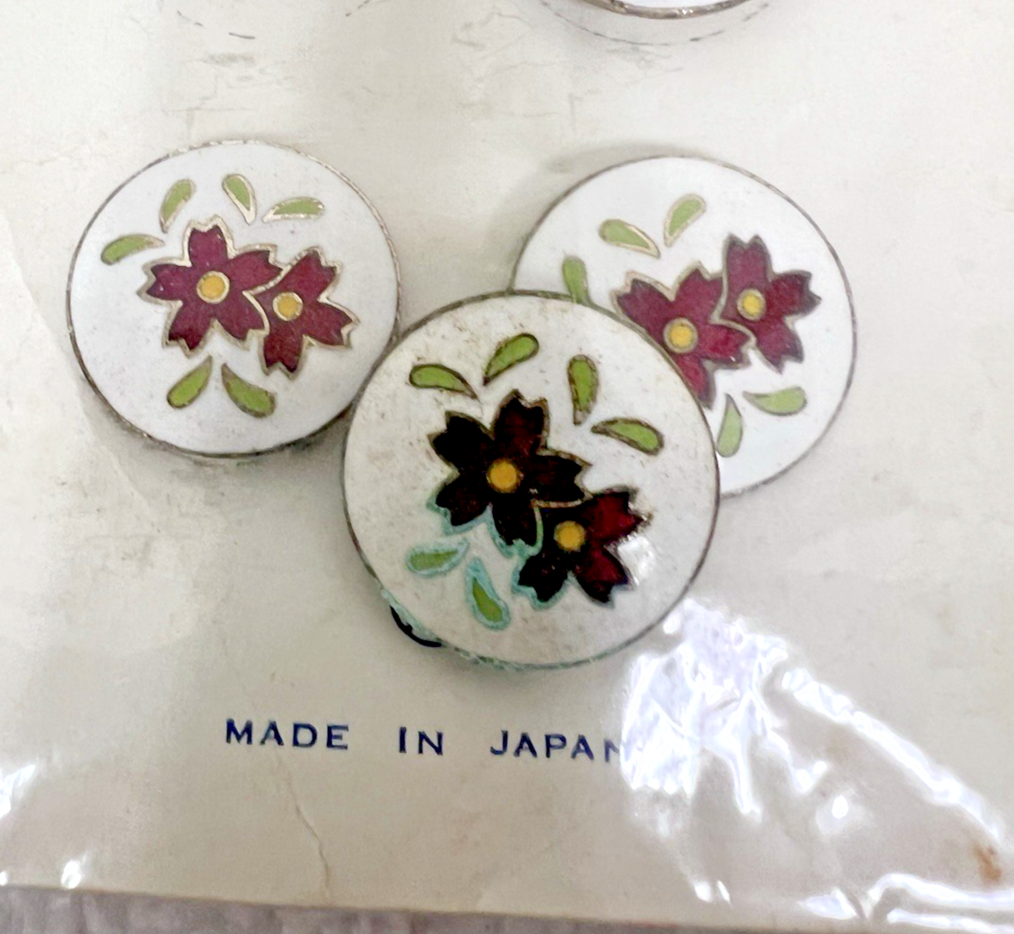 6 Vintage Japan Cloisonne Floral Enamel Buttons Original Package Card