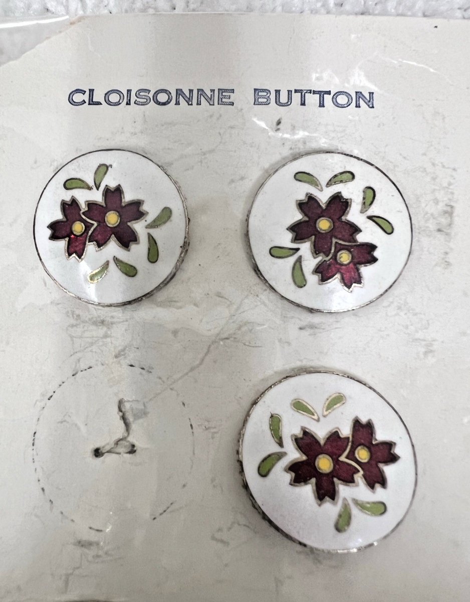 6 Vintage Japan Cloisonne Floral Enamel Buttons Original Package Card. 6 Japanese cloisonne white background red floral center buttons on card, one has come loose the rest unused still attached to the card, buttons measure approx. 3/4" wide, looks like some rusting to hook on back of buttons. See pictures.