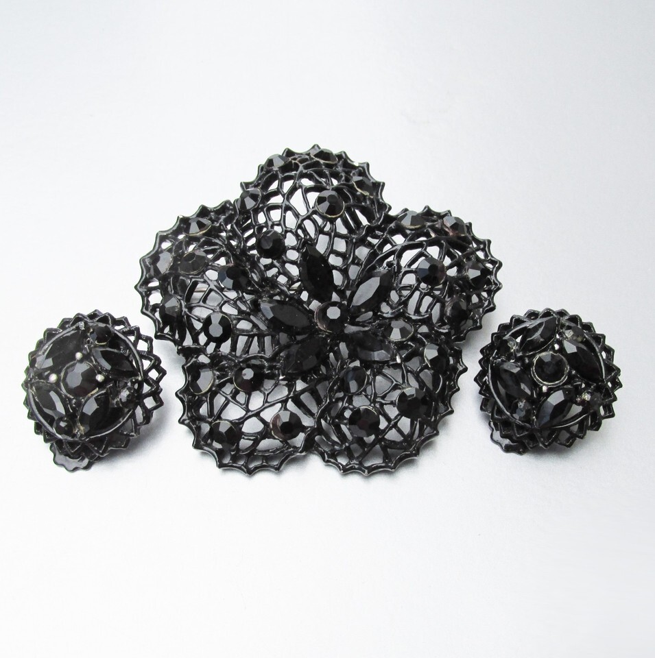 This very pretty vintage 1950s-1960s big flower filigree brooch and matching clip earrings set is covered with black enamel and black rhinestones in both marquise and round shapes. The pin measures 2 3/8" wide and the earrings are 1". It is in excellent condition with no wear or damage. It will arrive gift boxed. 2715