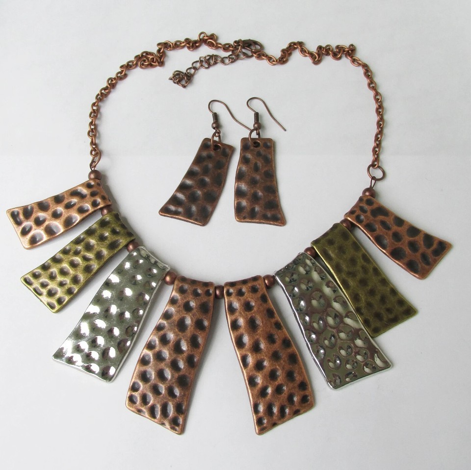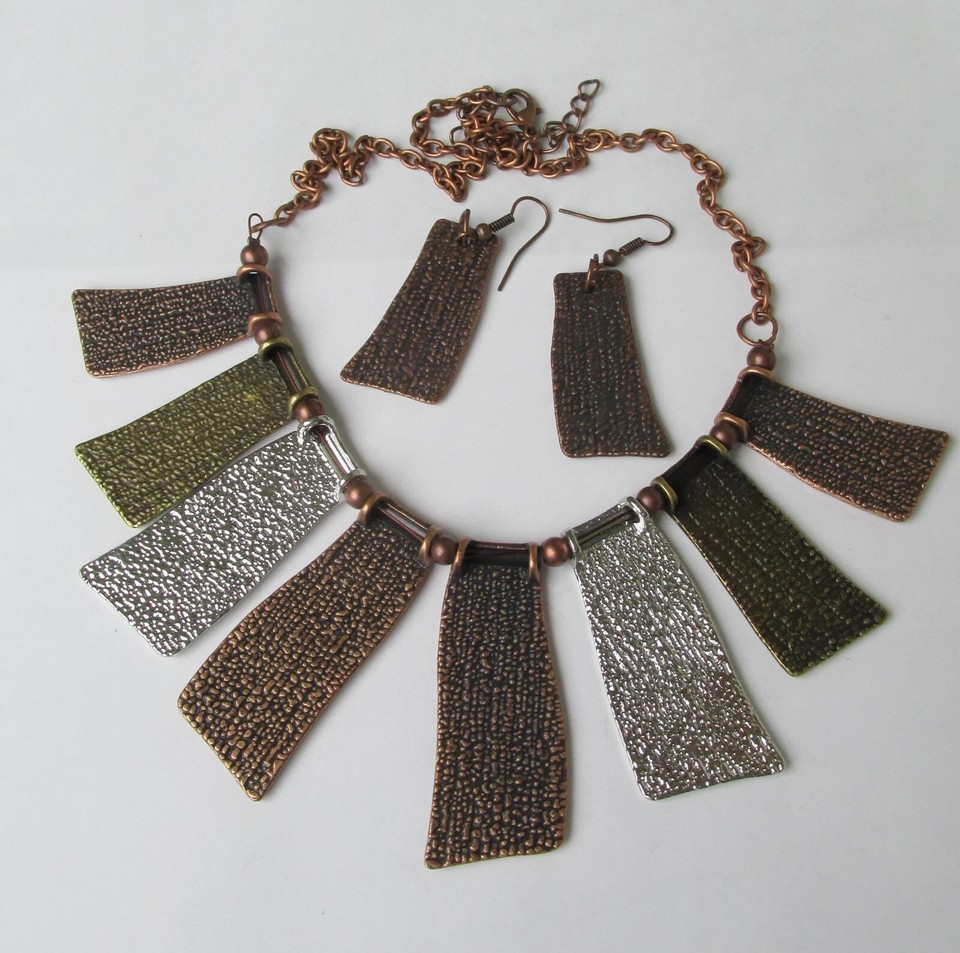 Hammered Copper, Brass, Silver Big BIB Collar Necklace Dangle Earrings Vtg Set