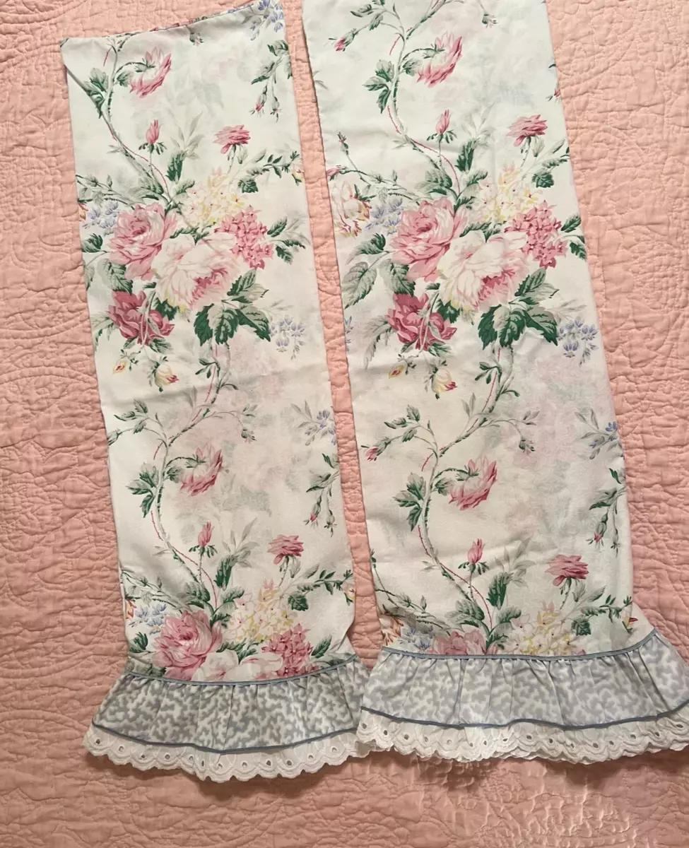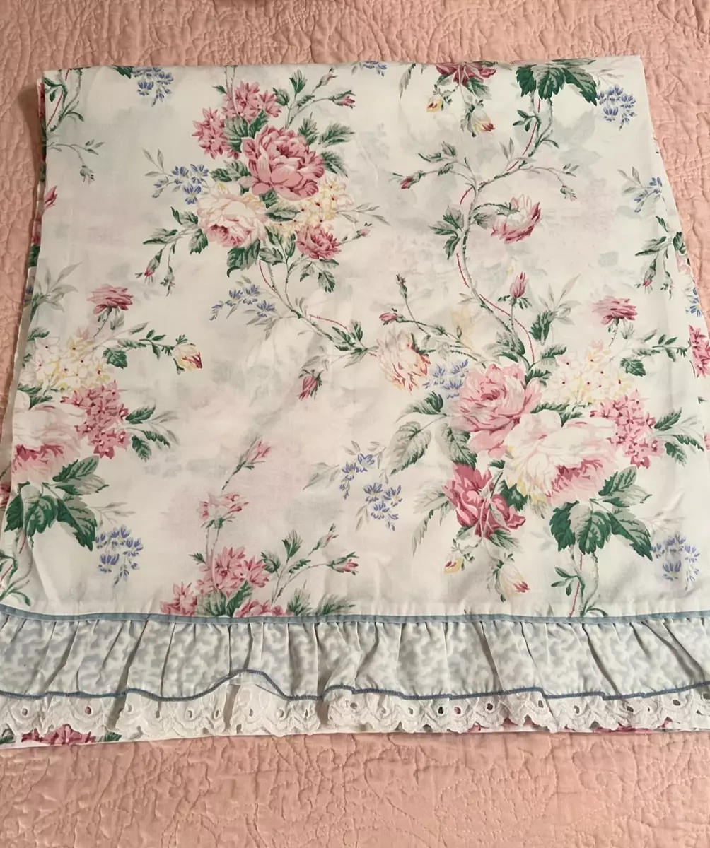 Features multi colored floral on vermicelli white with blue and eyelet ruffle.