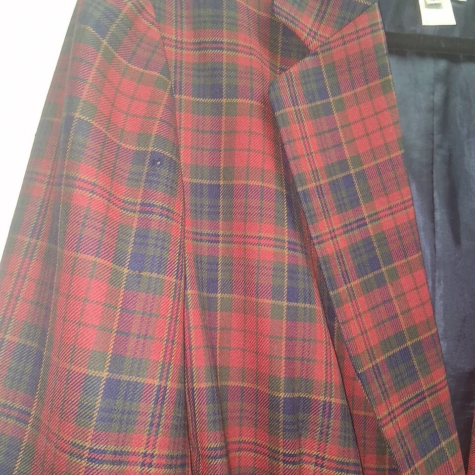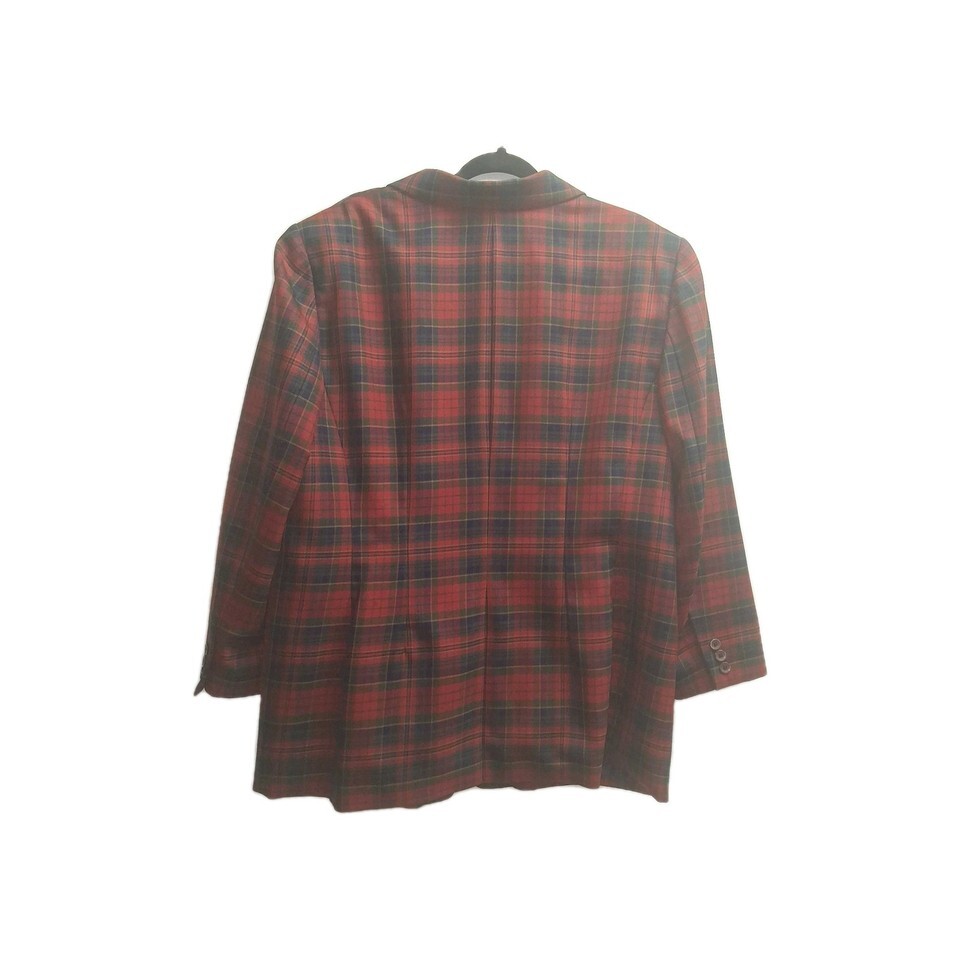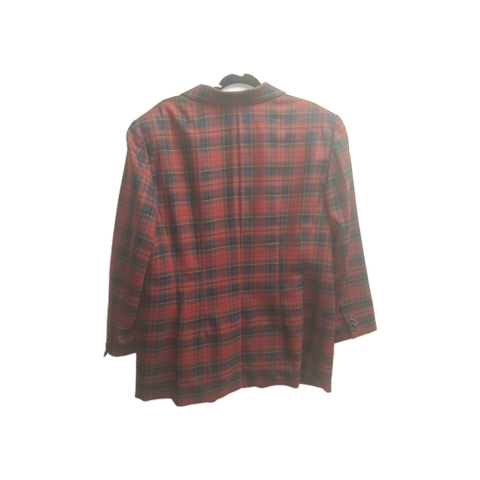 This Vintage Pendleton Red Plaid Jacket is a classic piece made from 100% virgin wool in a mid-length style. The jacket features a button closure and is designed for a business occasion. With a size 18W, this plus-size garment is perfect for women looking for a timeless, versatile outerwear option. The red plaid pattern adds a pop of color, while the wool insulation material ensures warmth during the winter, fall, and spring seasons. Has a small hole on the shoulder. Noted in picture 5. Made in the United States, this Pendleton jacket is a must-have for any wardrobe.