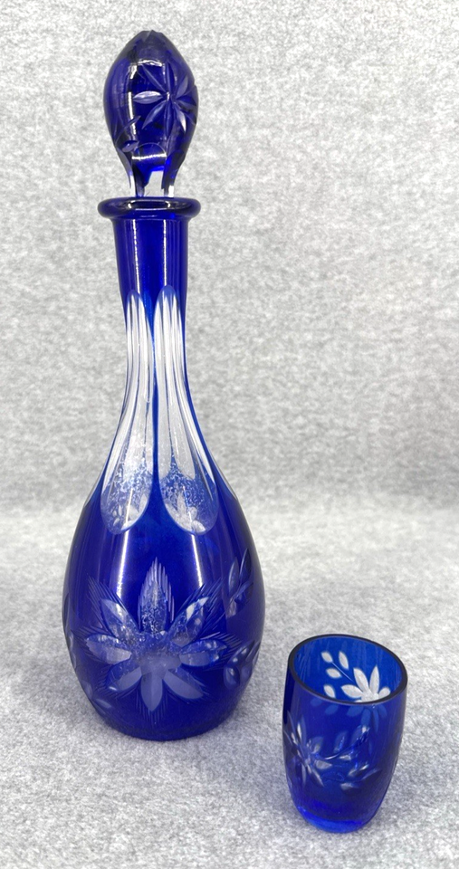 Vintage Bohemian Cobalt Blue Cut Glass Decanter w Stopper & Matching Cordial Gla