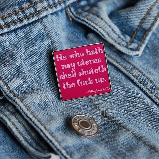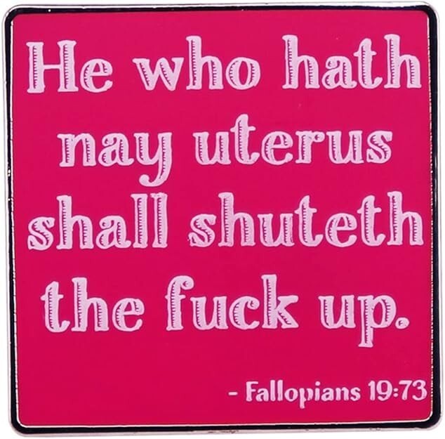 Make a bold statement with this satirical enamel lapel pin featuring the humorous quote ?He who hath nay uterus shall shuteth the f* up ? Fallopians 19:73.?** The design mimics a faux biblical verse and is intended as a piece of political or social commentary.
