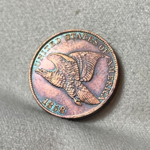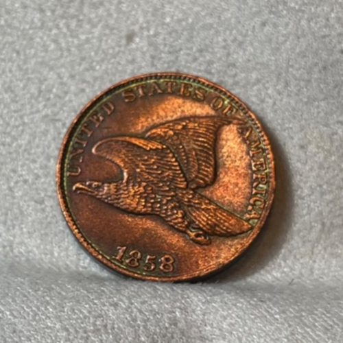 The 1858 Flying Eagle Cent is a circulated small cent composed of copper, minted in Philadelphia in 1858. This particular coin is a business strike type with a fineness of 0.95. It is a part of the historical Flying Eagle series and is uncertified. The coin features the iconic Flying Eagle design on the obverse and the wreath on the reverse, showcasing the artistry and craftsmanship of the era. could be a copy and I cant verify its authenticity.