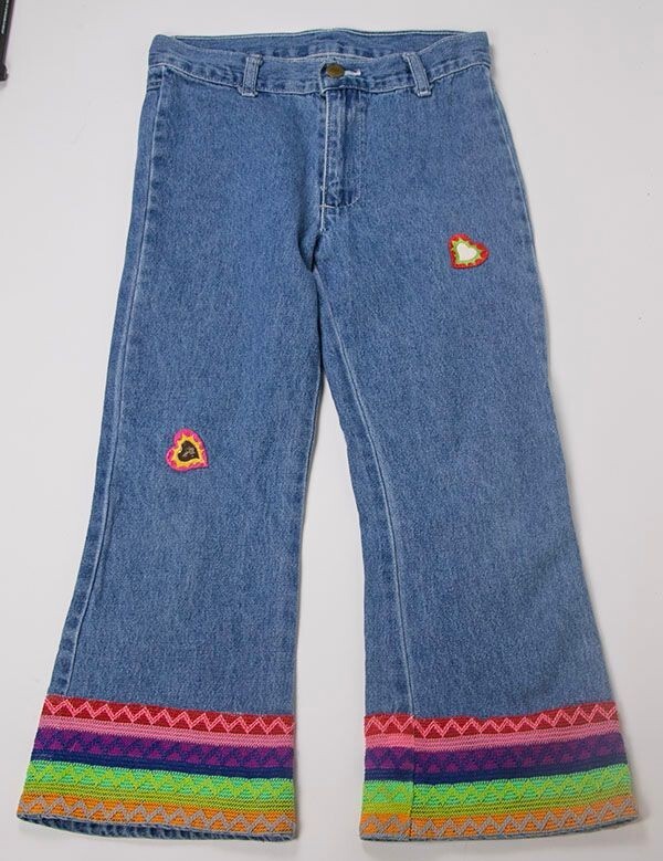 These are absolutely adorable girls capri pants in a Child Size 8. These denim capris have a flat front with no pockets in the front or back. They feature a colorful striped trim around the bottom of each leg and it has two colorful hearts on the front of each leg. Zip fron with button closure. 100% Cotton. Machine washable. They measure approx 28 inches from the top of the waistband to the bottom of the leg. The inseam is approx 20.5 inches The rise is approx 8.5 inches and the leg opending, across the front, is approx 8 inches. Measuring across the front of the waistband is approx 12.5 inches, laid flat. So cute!