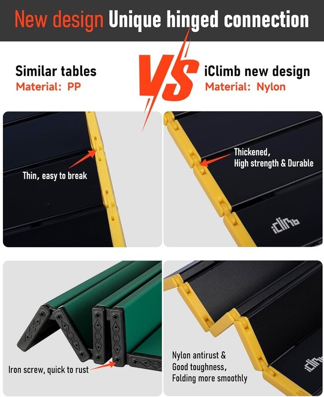 Ultralight, made of aerospace-grade aluminum alloy, only 2.2 lbs; Max Load 66 lbs; Unlike wooden or nylon-top tables, this table is durable, waterproof, corrosion-resistant, easy to clean; Sturdy joints and anti-slip feet keep the table stable, with legs that won?t fold, bend, or slip on any terrain; Very easy to set up, just open the base frame and attach the tabletop, enjoy your leisure time in seconds, video guide available on this page.
