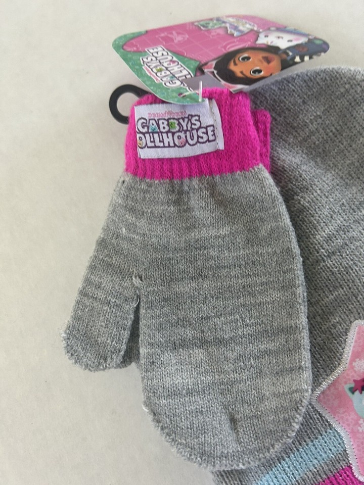 Gabbys Dollhouse Knit Hat Beanie & Mitten Set Kids DreamWorks Sparkly Pink BxX