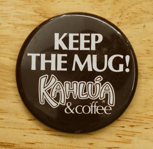 Vintage Pinback Button Keep The Mug Kahlua & Coffee Liquor Advertising
