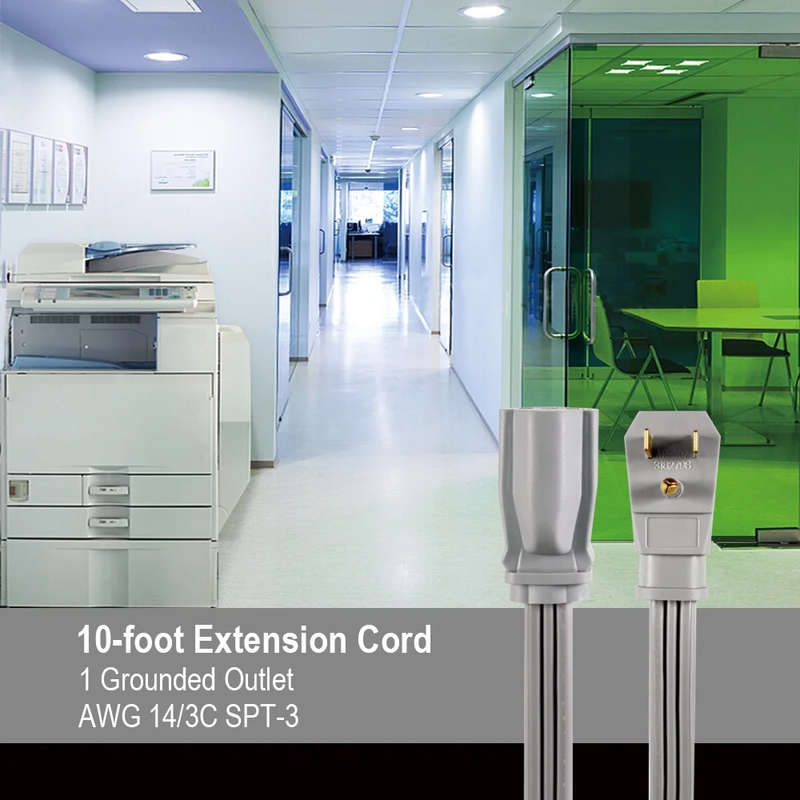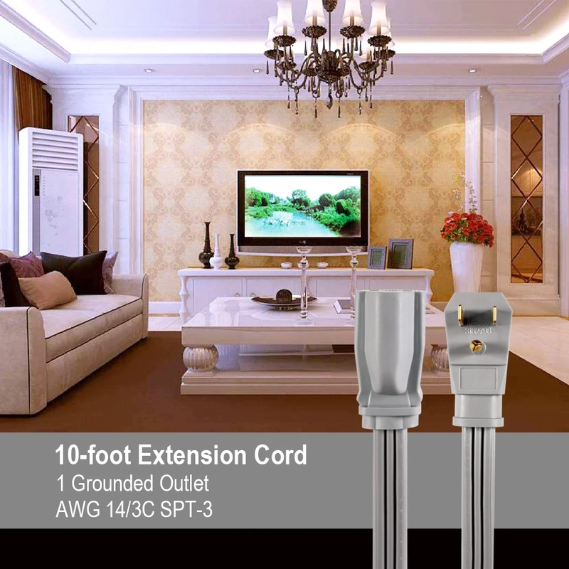 10Ft 14AWG 3-Prong Gray Indoor Air Conditioner Extension Cord 15 Amps