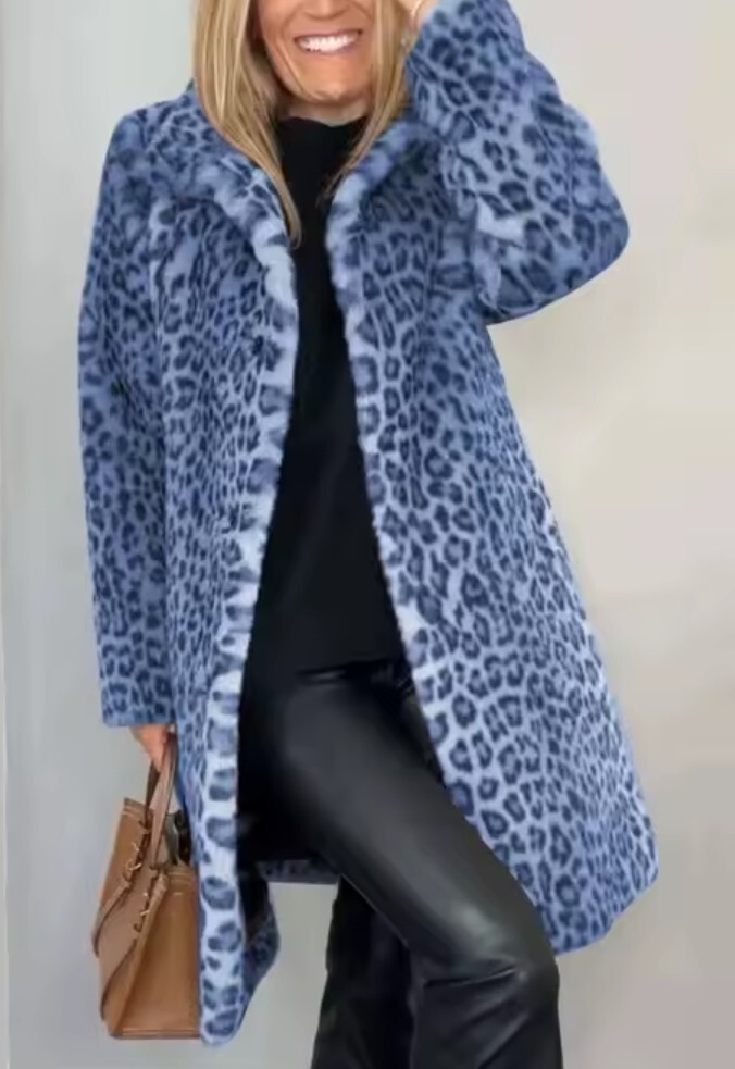 Blue Spotted Leopard Warm Soft Fleece Autumn and Spring Mid Length Fashion Coat