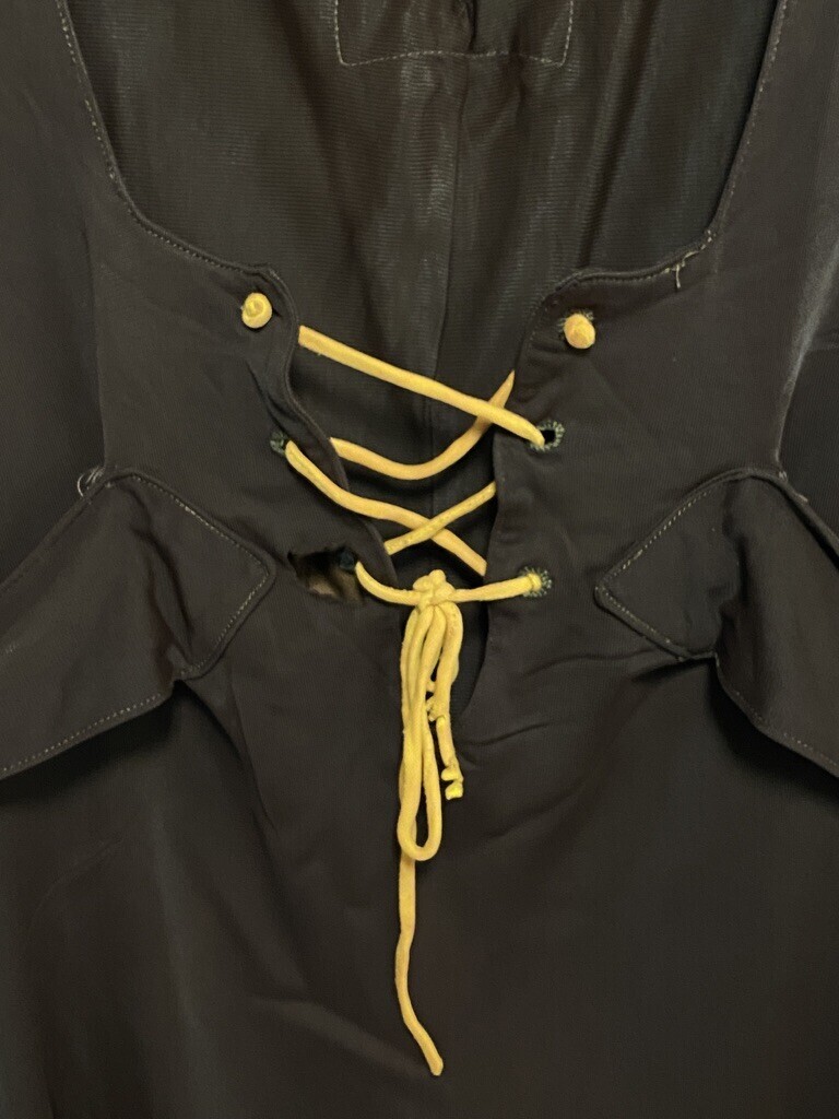 Very good vintage condition. No fading. One tiny clipped hole at back outer leg and a few places of missing topstitching. Structurally sound and wearable with care.
