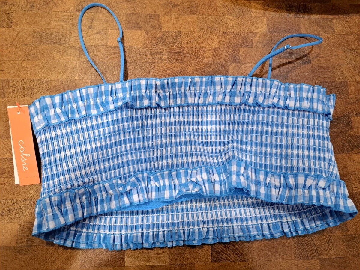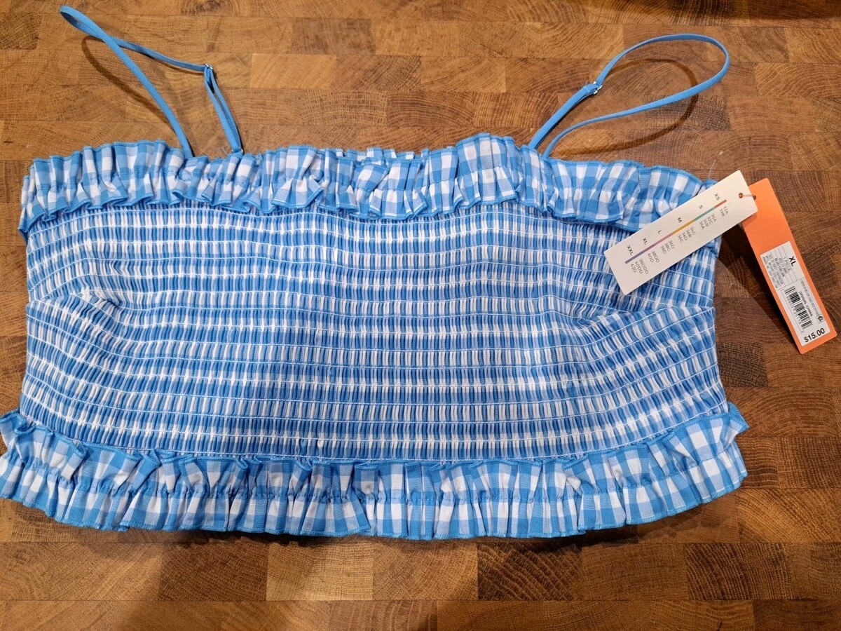 Colsie Women’s Smocked Bandeau Bralette Top Blue Gingham Ruffle Trim XL Swimwear