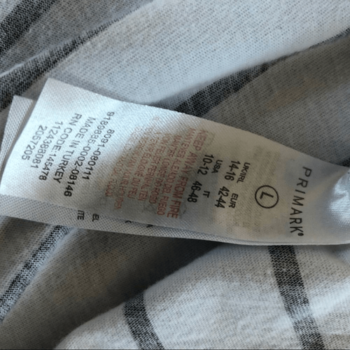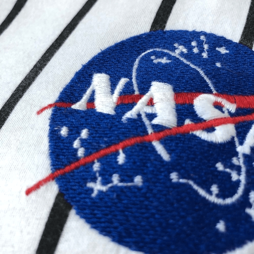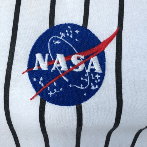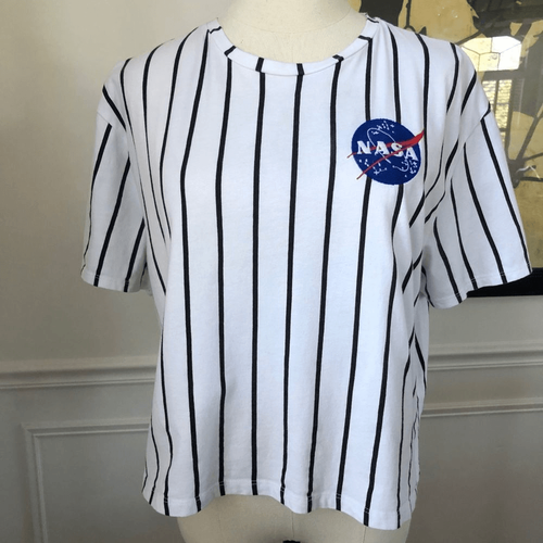 Primark NASA white T-shirt with black vertical stripes with a NASA patch embroidered on the chest. Approximately 20 inches from shoulder to hem and 21 inches from armpit to armpit. Size 10/12 which is equivalent to a US large