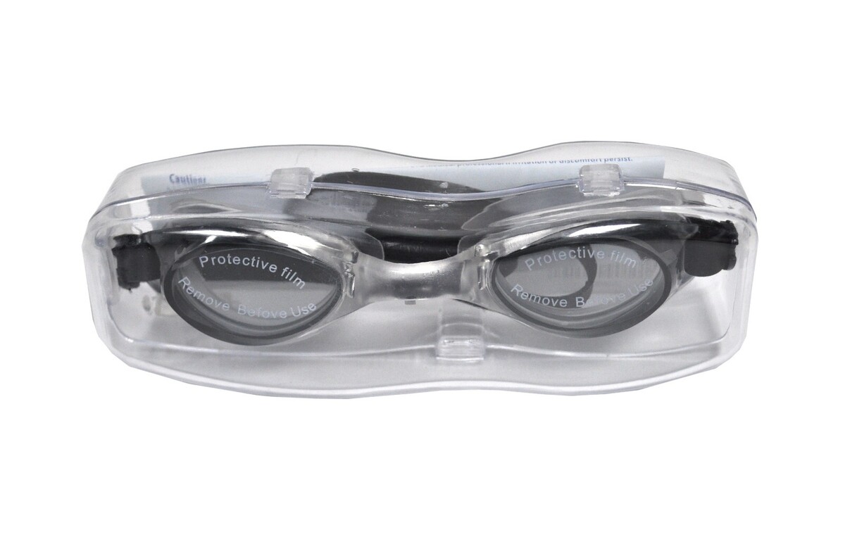 Package contains one pair of black accented swimming goggles in a plastic storage case. Includes ear plugs.