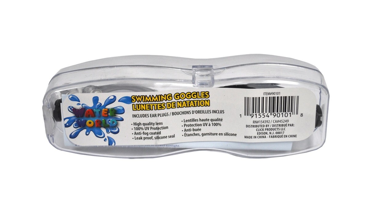 Water World Black Swimming Goggles. High quality lens. 100 percent UV protection. Anti-fog coated. Leak proof, silicone seal. Adult size goggles. Package contains one pair of black accented swimming goggles in a plastic storage case. Includes ear plugs. DDD-87090BLACK