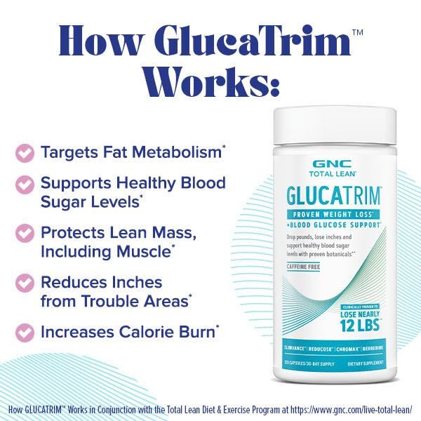 PROVEN WEIGHT LOSS: If you?re tired of feeling like your body is working against you, give your weight loss goals a boost with GNC Total Lean GlucaTrim?a multi-action weight loss supplement designed to help drop pounds and lose inches with proven botanicals PROTECT AGAINST LEAN MASS LOSS: Starting?or stepping up?your weight loss journey can impact lean mass you want to keep GlucaTrim?s Slimvance and Chromax also help protect lean mass, including muscle, which supports metabolism during weight loss POWERFUL BOTANICALS, NO PRESCRIPTION NEEDED: GlucaTrim includes Berberine and supports your weight loss goals with Slimvance?s clinically proven blend of moringa, curry, and turmeric CAFFEINE-FREE WEIGHT LOSS SUPPORT: If caffeine doesn?t feel right for you?or if you?re already loving your coffee and don?t want to overdo it?GlucaTrim is caffeine-free and works with a variety of gluten-free and vegetarian diets Use in conjunction with the Total Lean diet and exercise program program