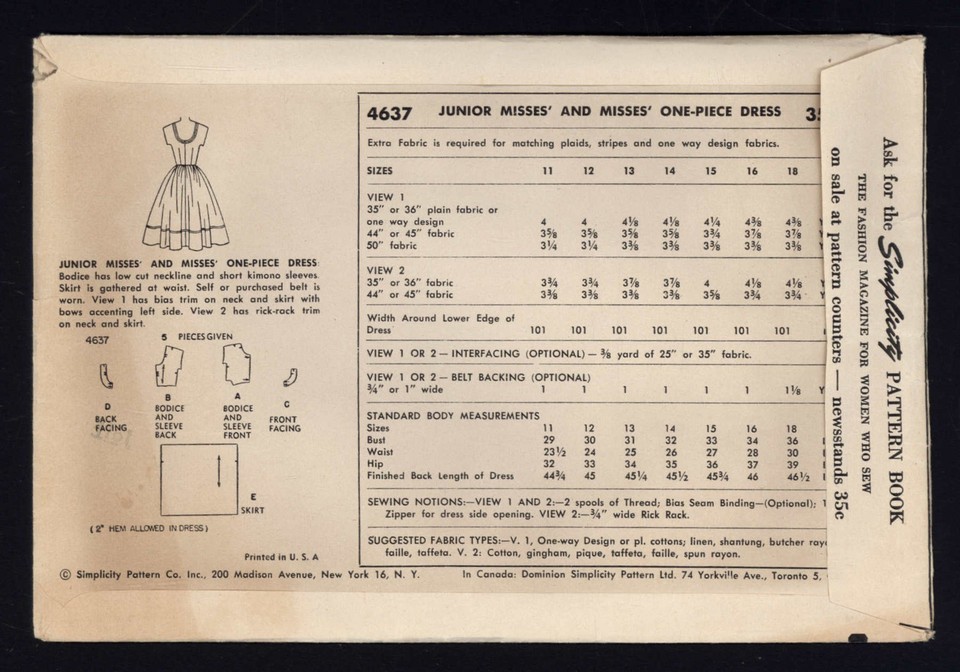 SIMPLICITY pattern 4637 * Misses' one piece DRESS * size 13 bust 31 Pattern cut