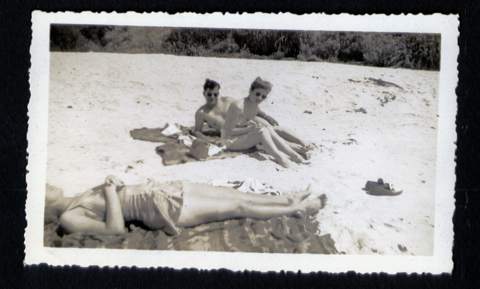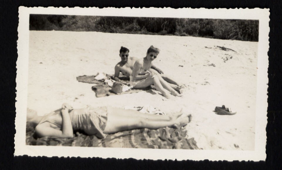 SNAPSHOT from ALBUM * BEACH Woman missing part of head SUNBATHING couple watchin