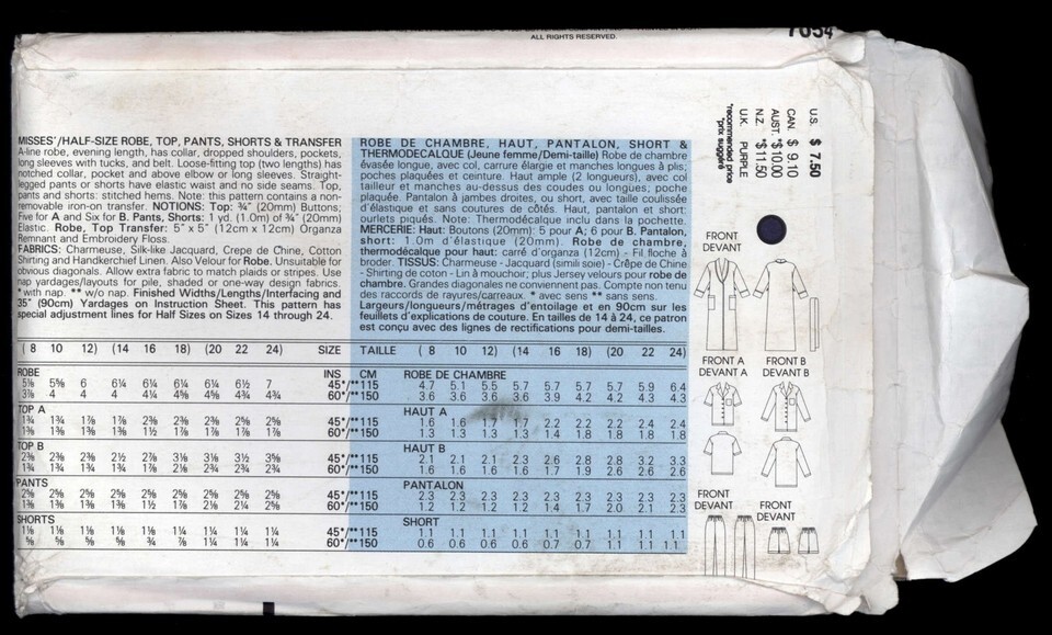 VOGUE Pattern No # 7054 * MISSES LONG & HALF SIZE ROBE, TOP, PANTS 8-10-12 uncut