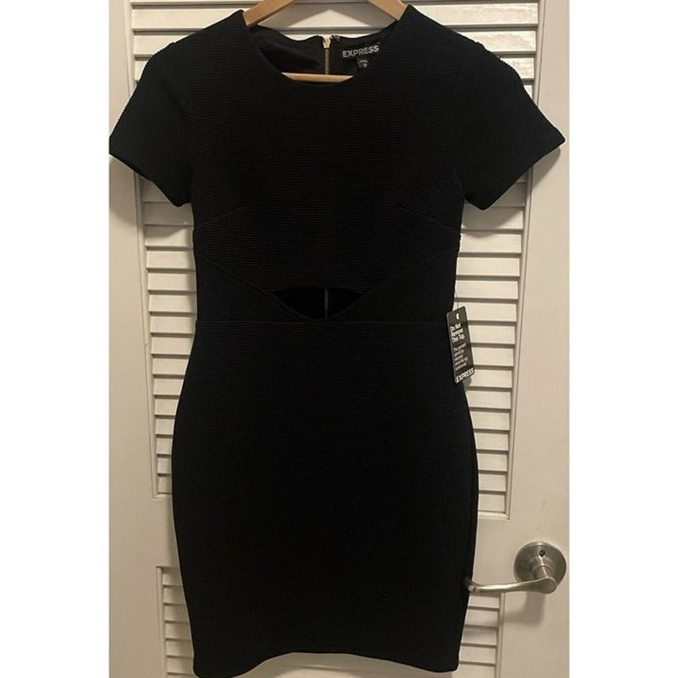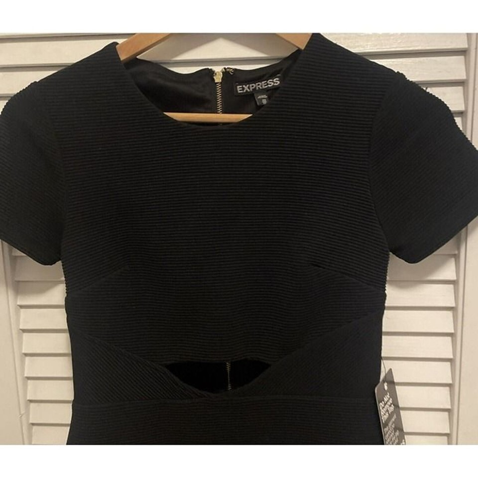 NWT Express Dress Womens Size XS Black Cut Out Front Stretch Ribbed Mini Bodycon