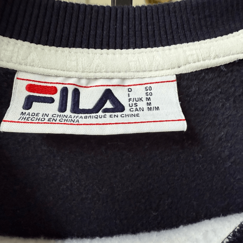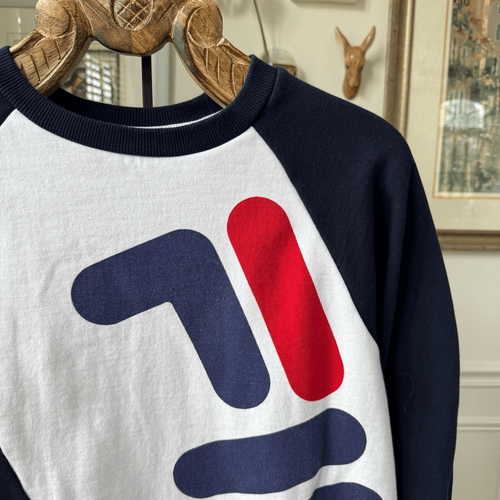 Men?s Fila, cotton and polyester blend logo Emmett sweatshirt. Colorblock in navy blue, white and red. Laying flat measures 24 inches shoulder to hem and 22 inches armpit to armpit..