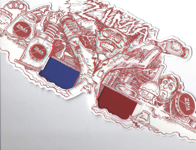 Front side of thin cardboard paper glasses features a 3-D drawing of a mad scientist brewing up Zima in a spooky laboratory.