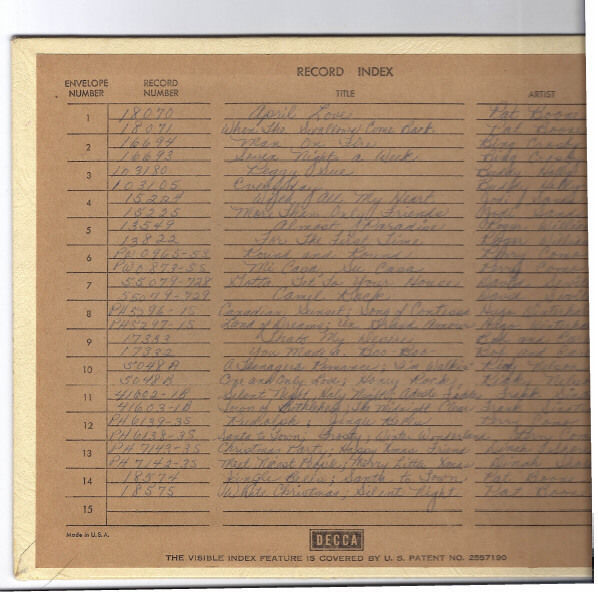 On the inside front cover is a pre-printed index form which has spaces for only 15 pages (two-sided), and has a handwritten list of 45's up to envelope number 14. (see scans/photos)