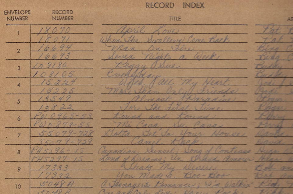 15) Blank Space in handwritten Index. In the #15 sleeve is a very Rare Columbia Records # 5-2041 - White Christmas from Paramount Pictures Rosemary Clooney with Percy Faith and the Mellomen - Embossed into the inner ring is the number; ZEP34134-1C directly across is the letter "H"