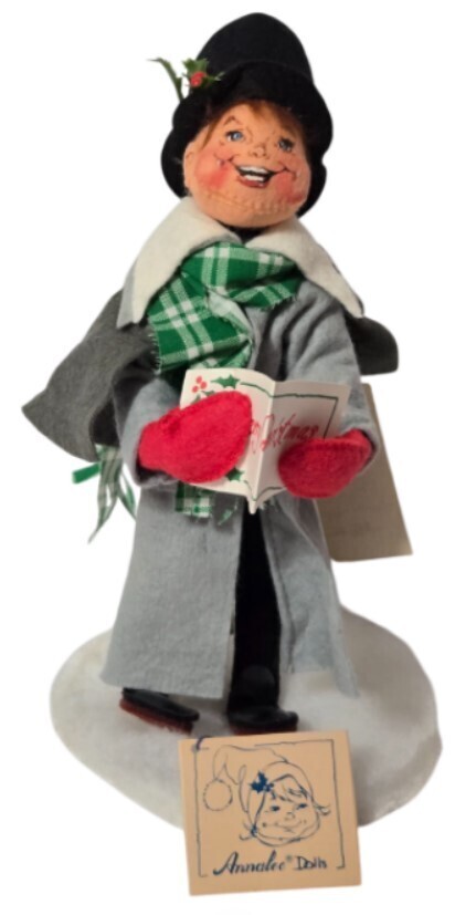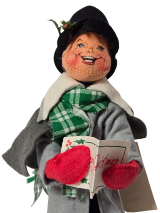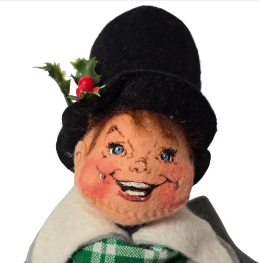 Add a touch of vintage New Hampshire charm to your holiday display with this delightful 1989 Annalee Mobilitee Christmas Caroler. Handcrafted in Meredith, NH, this 7-inch felt doll features the classic whimsical "Annalee smile" and is dressed in a formal grey overcoat, green plaid scarf, and a black top hat adorned with holly berries.