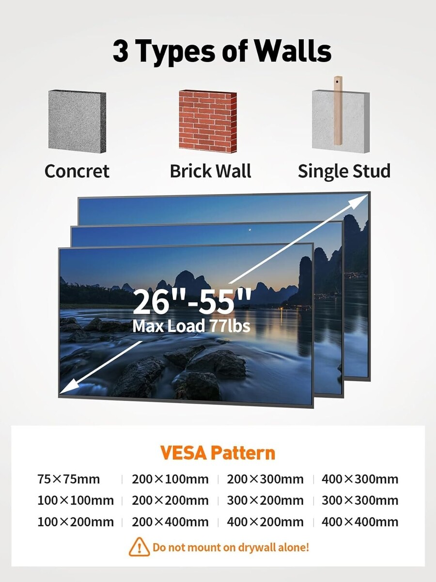 Tv Wall Mount Applicability: TV brands between 26 and 55 inch screen sizes and up to 77 lbs, with VESA 75x75mm ? 400x400mm mounting pattern fits.