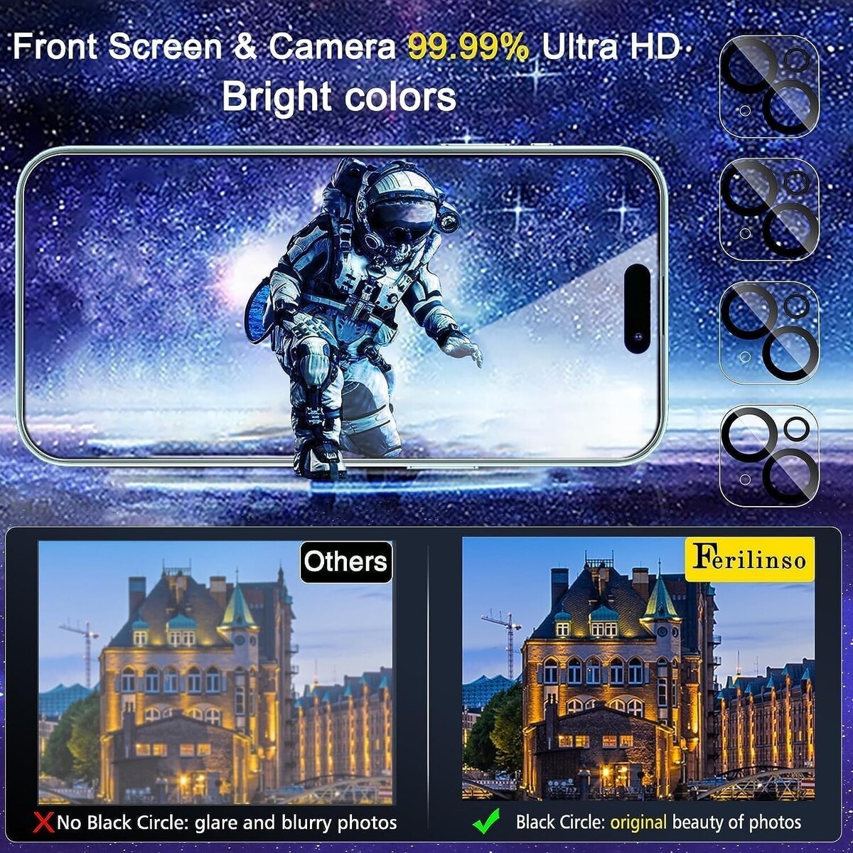 Camera Protector Case-Friendly: Ferilinso lens protector made of 9H+ glass effectively protect entire lens from drops, scratches and not easy to fall off. Special designed Black circle suitable night shooting function, Clearly capture every moment, without distortion or obstruction, completely maintain the original beauty of photos and videos. We care about every detail, this Camera and screen protector designed to be suitable with 99% cases.