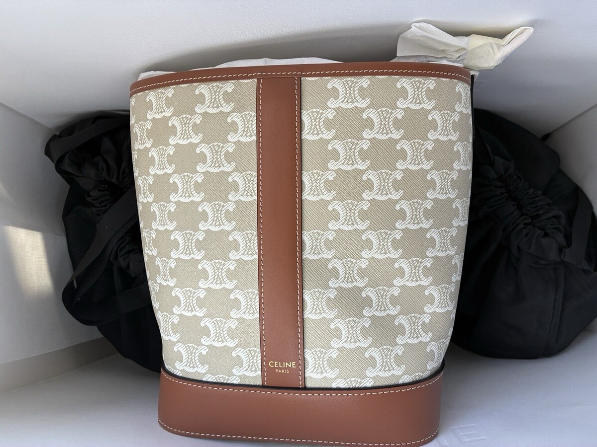 NEW Celine Small Bucket Triomphe Canvas GREGE Beige & gold / brown Calfskin