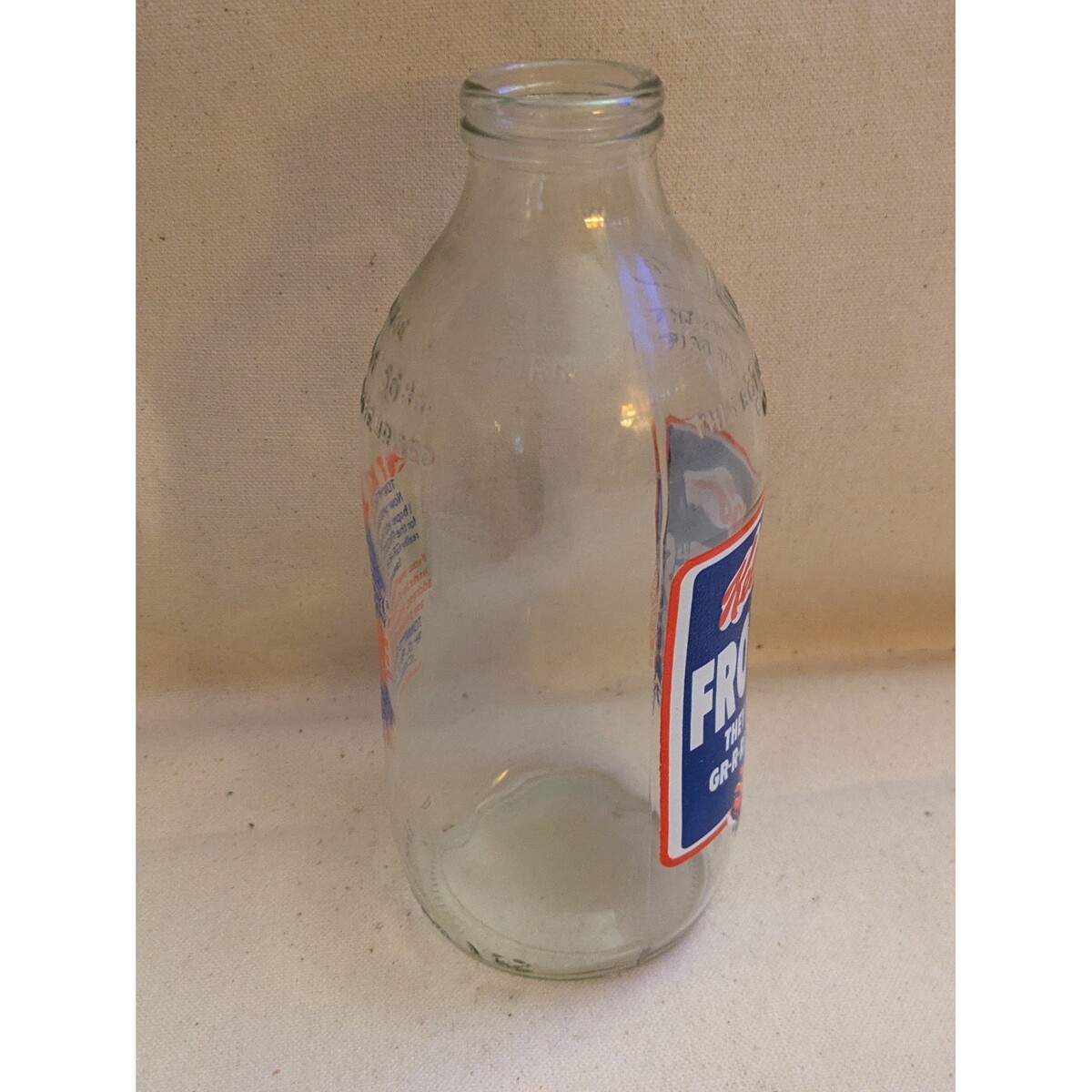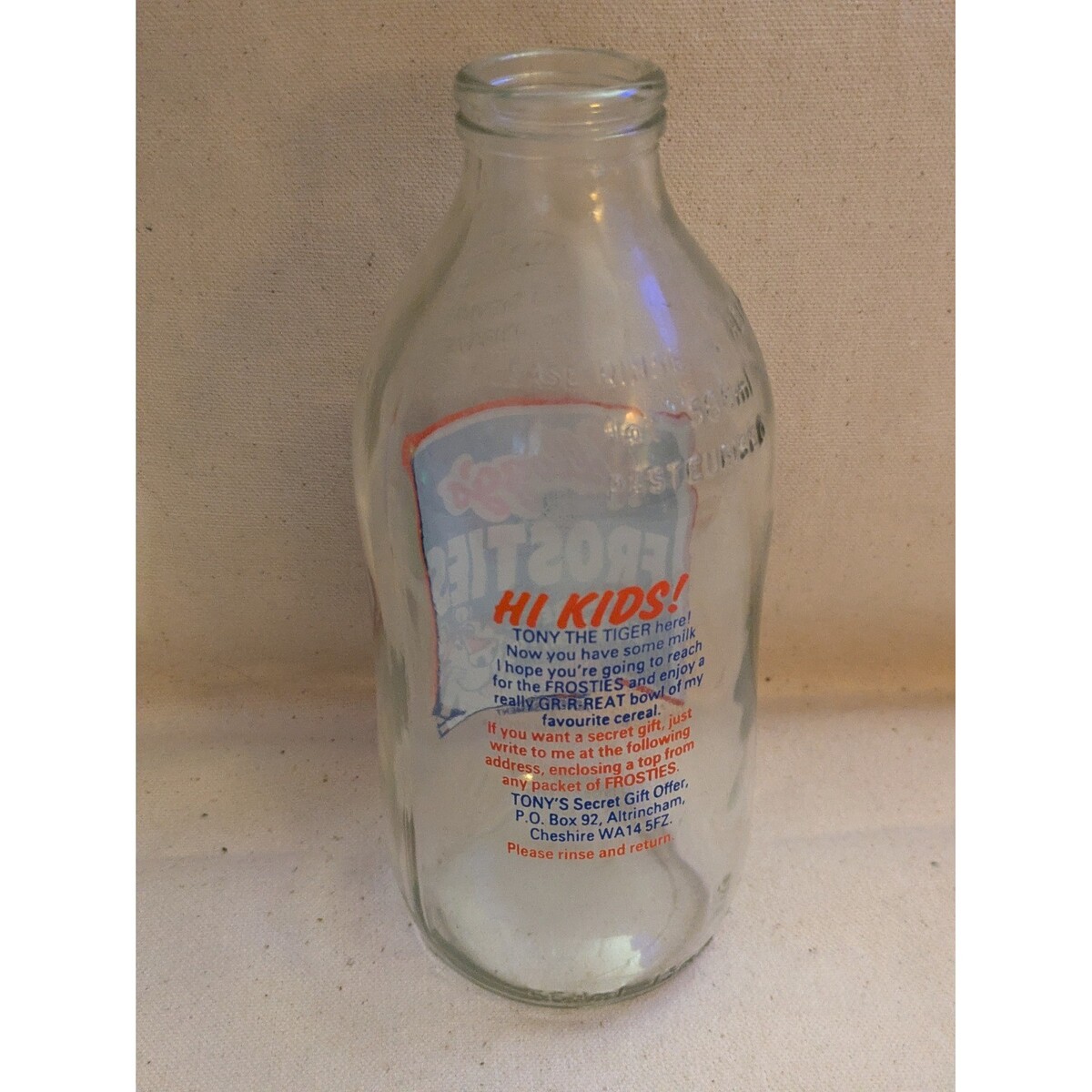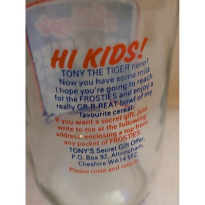 Mots cles : Kelloggs Frosties, Tony le Tigre, bouteille vintage, verrerie, souvenirs du petit-dejeuner, publicite sur les cereales, objet de collection, cuisine retro, nostalgique, objet d'exposition, objet de collection publicitaire, bouteille de lait