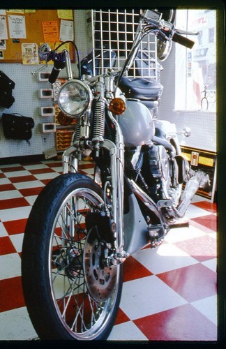35 mm color slide * 1987 INSIDE VIEW of MOTORCYCLE SHOP Bike parts signs