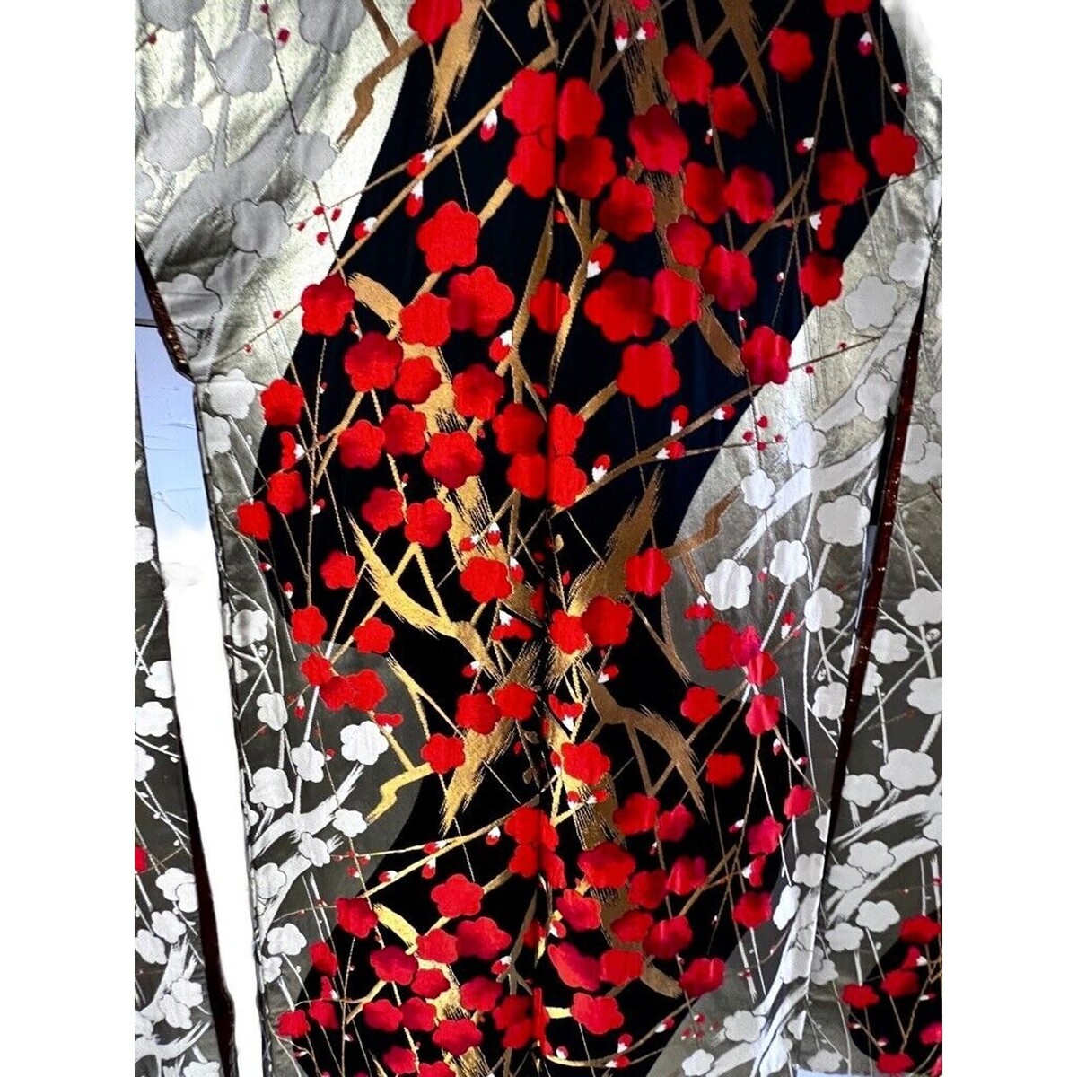 Uchikake are the most formal category of Japanese bridal kimono, worn as an outer robe during wedding ceremonies and elite occasions. This example emphasizes seasonal florals and branching motifs?symbols of renewal, prosperity, and continuity?executed in silk with dramatic metallic contrast. Likely mid-20th century, produced for ceremonial rather than daily wear.