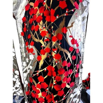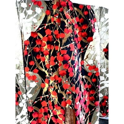 What you?ll love about this Japanese uchikake is the striking contrast between its deep black silk ground and the vivid overlay of orange, white, and gold floral branches rendered in silk and metallic embroidery. Designed as a formal wedding over-kimono, this piece was created to command presence through color, sheen, and scale rather than figurative imagery.