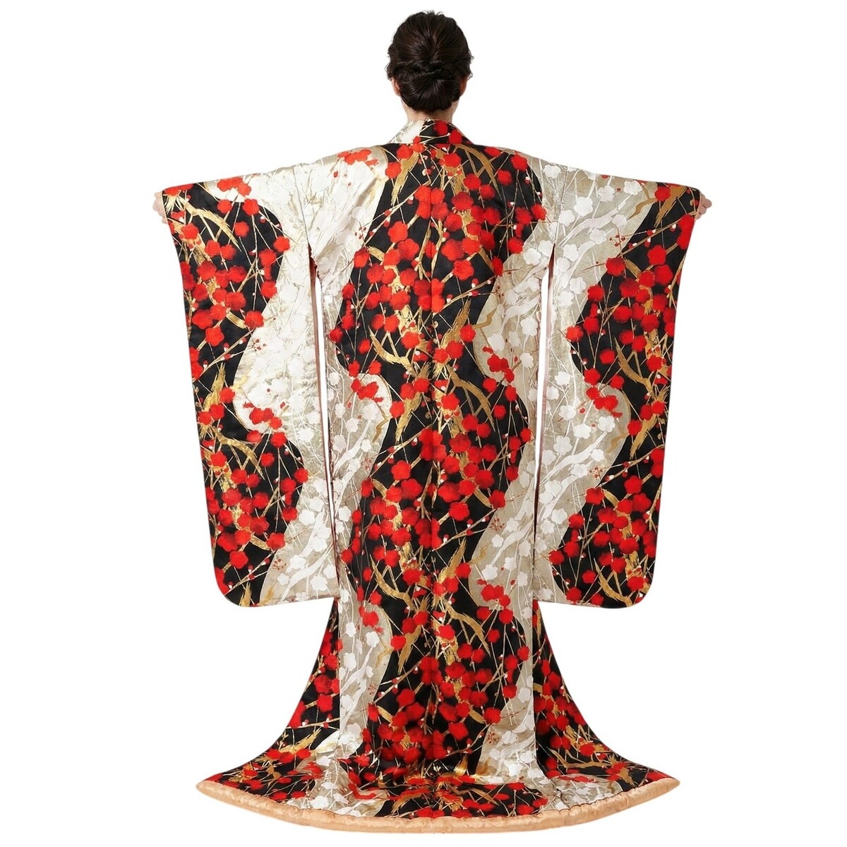 Traditional uchikake silhouette intended to be worn open over another kimono or displayed. Extra-long body with wide sleeves and a trailing hem designed for ceremonial procession.