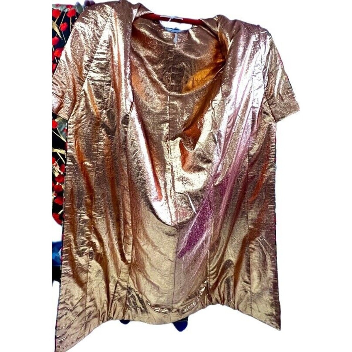 Very good vintage condition overall. One seam is open at the underarm/pit of one sleeve (shown clearly), an easy professional repair with no fabric loss. No stains, no fabric splitting, no odor. Metallic areas remain bright and reflective. Light age-appropriate handling wear only. .