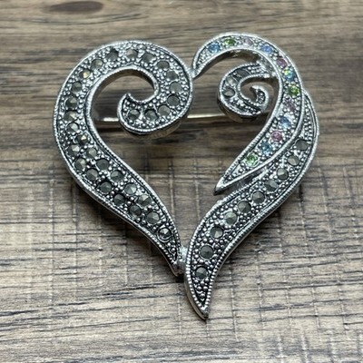 Vintage Open Heart Brooch Pin Pave Set Pastel Faux Marcasite Rhinestone KG JD