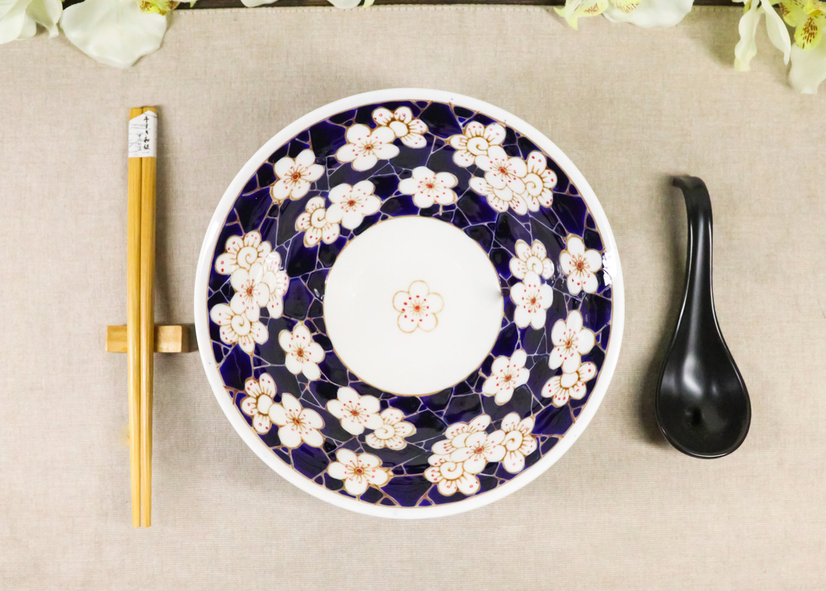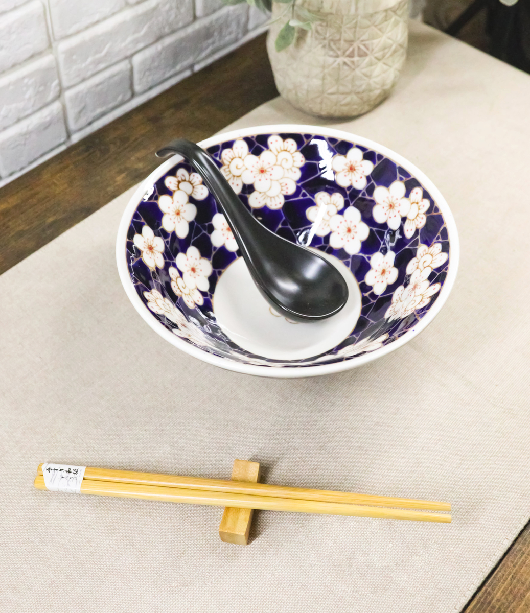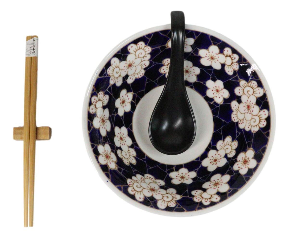 White Ume Plum Flowers Ceramic Ramen Bowl Soup Spoon Chopsticks And Rest Set