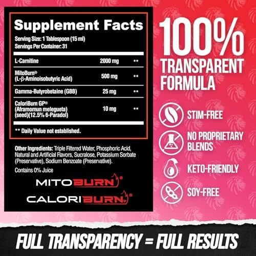 *World's FIRST liquid fat burner with MitoBurn CaloriBurn GP. Fast-acting results in 15 mins vs 45+ for pills. Caffeine-free = no jitters or crashes. Combines L-Carnitine GBB for maximum thermogenic effect.