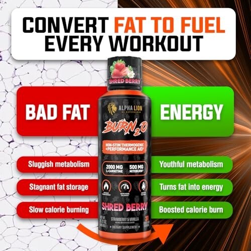 ADVANCED LIQUID L-CARNITINE 2000MG FORMULA: Alpha lion burn2O liquid fat burner combines 2000mg of L-Carnitine with MitoBurn and CaloriBurn GP for powerful thermogenic fat-burning. This carnitine liquid metabolism booster is designed to support fat loss without intense workouts. CAFFEINE-FREE FAT BURNER FOR MEN WOMEN: Boost metabolism and burn stubborn fat without caffeine or crashes. Our liquid L-Carnitine fat burn formula provides sustained energy and supports weight loss, helping busy individuals enhance fat-burning and improve workout performance. THERMOGENIC SUPPORT FOR FAT BURNING: Featuring MitoBurn and CaloriBurn GP, our thermogenic fat burner activates Brown Adipose Tissue (BAT), enhancing thermogenesis to boost calorie burning and convert stored fat into fuel, helping you reach your fitness goals more effectively. VEGAN FASTING FRIENDLY: Alpha carnitine liquid is zero-calorie, sugar-free, gluten-free, and vegan-friendly , making it suitable for keto, fasting, and other clean diets. Crafted in a cGMP-certified facility, it?s designed for a health-conscious, transparent approach to fat burning. EASY DELICIOUS PRE-WORKOUT ENERGY SUPPLEMENT: Enjoy Burn 2O l cartinine liquid as a flavorful pre-workout shot or for daily fat-burning support. Available in refreshing Grapezilla, ShredBerry, and ScorchBerry flavors your metabolism an enjoyable part of your routine. THE FIRST ONLY L-CARNITINE LIQUID FAT BURNER: Meet Burn2O?the first liquid fat burner with MitoBurn CaloriBurn GP in a delicious, calorie-free shot! Enjoy bold flavors like Grapezilla, ShredBerry, and ScorchBerry, and make metabolism-boosting the tastiest part of your day.